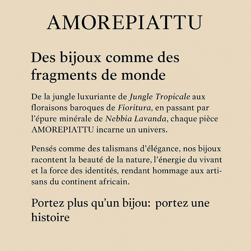 AMOREPIATTU est une maison de créations artisanales inspirée par la nature, les voyages et l’âme du monde. Chaque pièce est une histoire à porter, conçue à la main avec amour et intention.