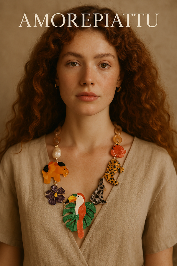 Step into the vibrant rhythm of the tropics with Jungle Tropicale, a bold and joyful statement necklace that celebrates the raw beauty of nature. Designed as a wearable jungle dream, this piece features colorful resin links, a handcrafted toucan, lush monstera leaves, and radiant hibiscus blooms. Each element brings a touch of the exotic, as if carried by a warm tropical breeze.