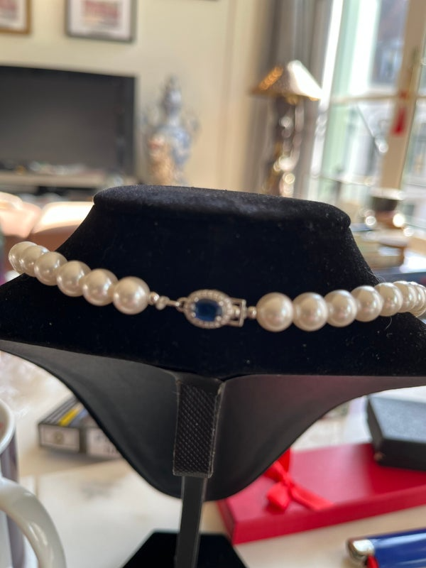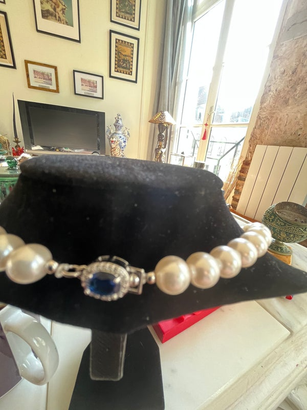 Les perles Akoya, sélectionnées pour leur lustre exceptionnel et leur douceur, sont parmi les plus précieuses des perles d’eau douce japonaises. Elles symbolisent la pureté et la sophistication, offrant une brillance incomparable. Associées à un fermoir orné de cristal bleu, elles rappellent l’élégance des bijoux d’apparat et le raffinement des traditions joaillières.