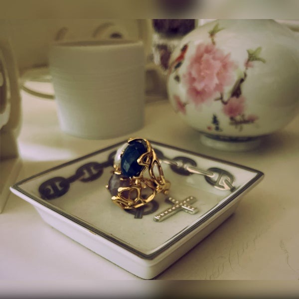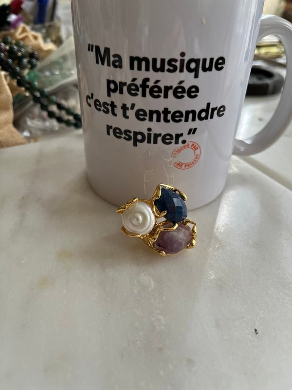 Cette bague audacieuse et organique marie trois pierres emblématiques dans un sertissage irrégulier doré à l’or fin. Chaque élément est choisi pour son énergie et sa beauté naturelle, offrant une pièce sculpturale, puissante et poétique.