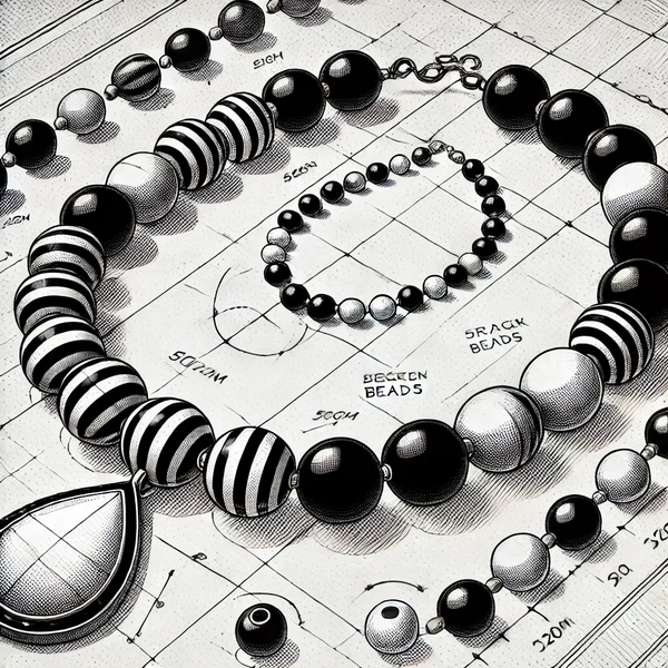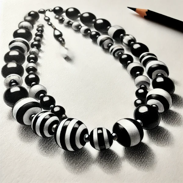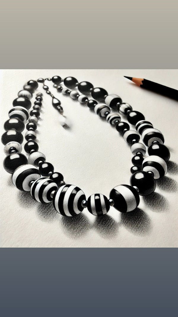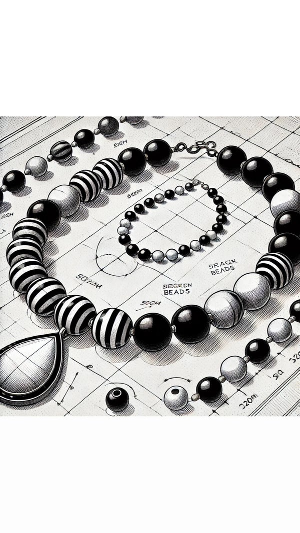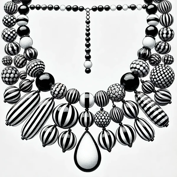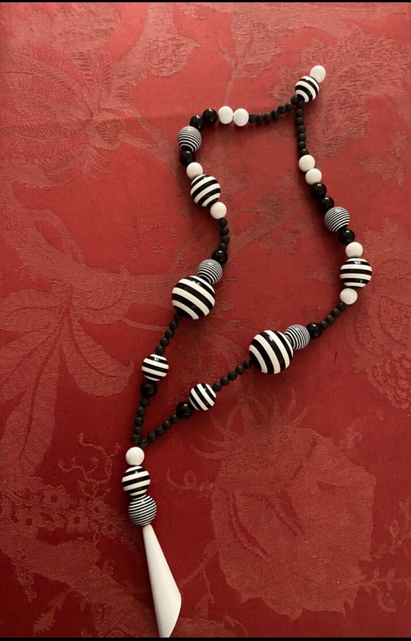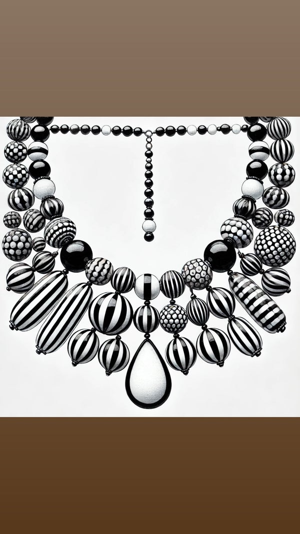 This elegant necklace features a striking black and white color scheme, with alternating striped beads that create a bold, modern look. The beads are artfully arranged on a black beaded chain, adding a touch of sophistication. A sleek, minimalist pendant at the end of the necklace completes the design, making it a versatile accessory perfect for both casual and formal occasions.