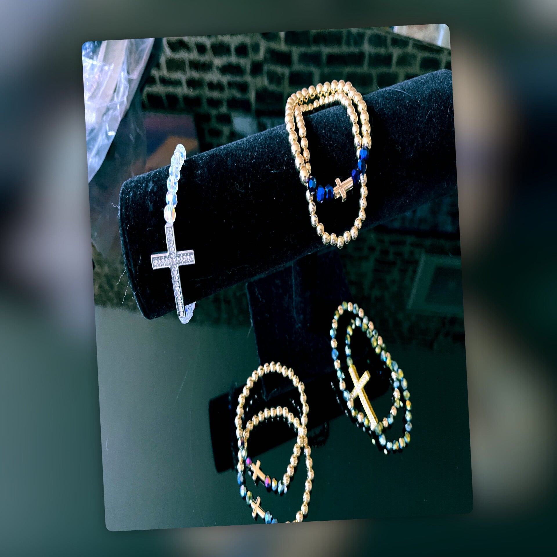 Audacieux et vibrant, ce bracelet double associe perles miroir multicolores, noir profond et croix dorée.