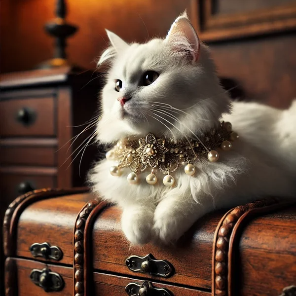 Allongé sur un coffre en bois ancien, ce chat au pelage immaculé arbore un collier sophistiqué orné de perles et de broderies délicates. L’ambiance feutrée et les meubles en bois confèrent une atmosphère empreinte d’histoire et d’élégance.