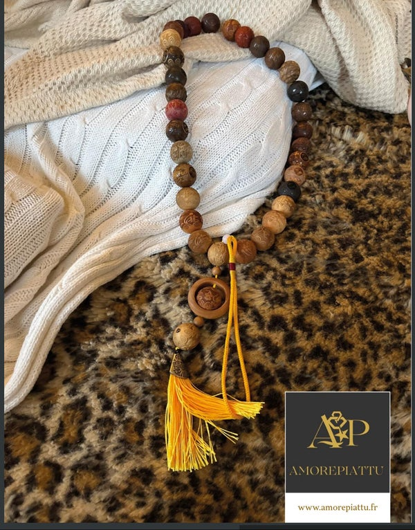 Le collier Agornamé incarne l’élégance spirituelle et l’ancrage à la Terre. Entièrement réalisé à la main, il associe des perles naturelles sculptées, aux teintes profondes et chaudes, à un pompon lumineux d’un jaune éclatant, symbole d’énergie et de vitalité.