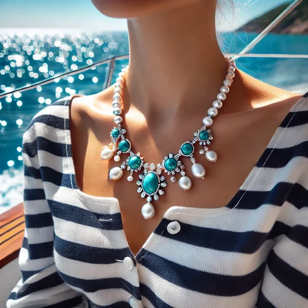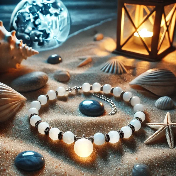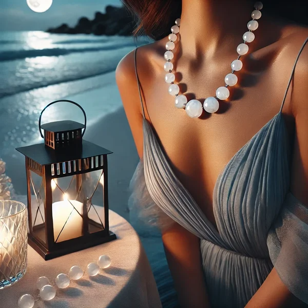 • Description : Ce collier met en valeur des perles de lune aux reflets nacrés, rappelant la lueur douce de la lune sur l’océan.