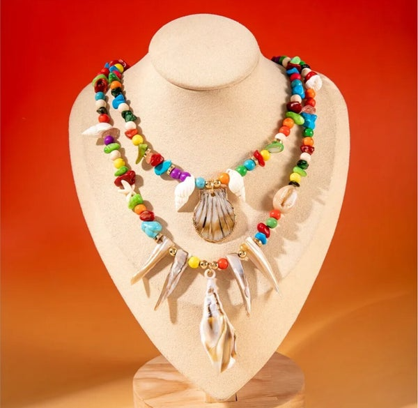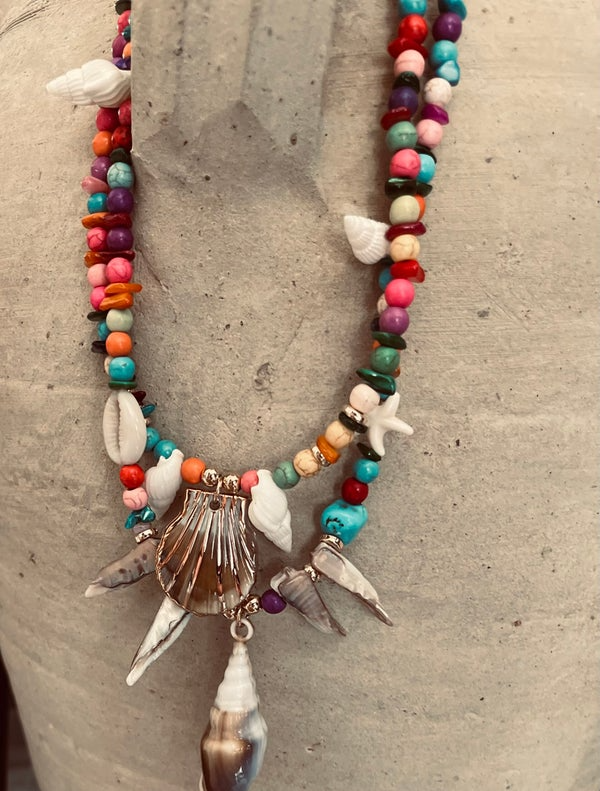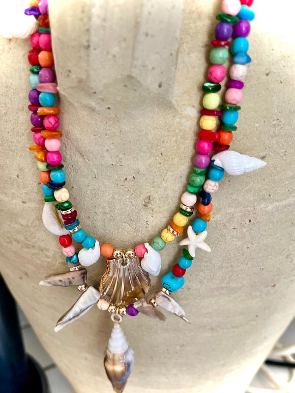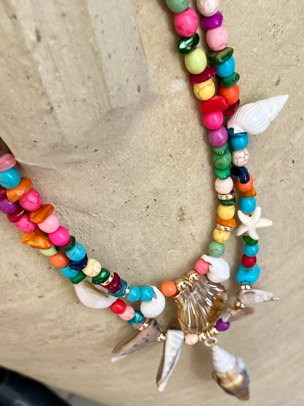Le collier « Trésor des Îles » est une invitation au voyage, un hommage vibrant à la beauté sauvage des rivages tropicaux. Composé de perles multicolores naturelles, il célèbre la joie de vivre, la liberté et l’esprit nomade. Deux rangs de perles soigneusement assemblées encadrent des pendentifs coquillages, ailes sculptées et éclats nacrés qui capturent la lumière comme l’écume sur les vagues.