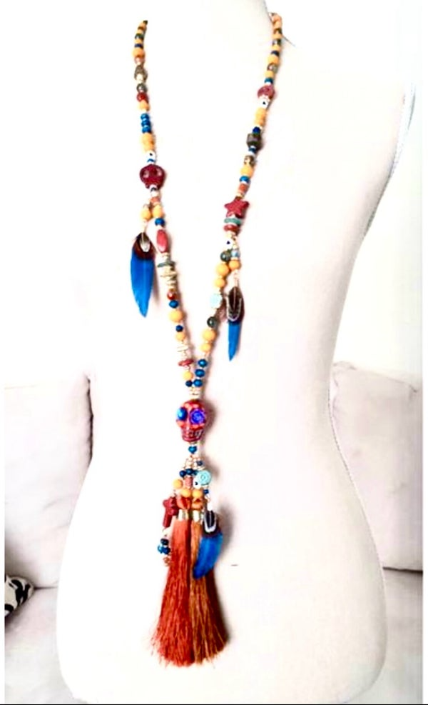 Inspiré par les traditions tribales et les symboles sacrés du monde entier, ce collier long est bien plus qu’un accessoire : c’est une pièce de caractère, chargée de sens et façonnée à la main avec une minutie extrême. Il évoque la force intérieure, les rituels de passage, l’esprit voyageur et l’amour de la terre.