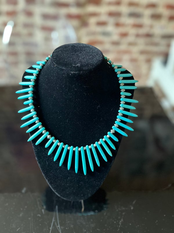 Ce collier est une pièce audacieuse et sculpturale, mettant en valeur la turquoise en forme d’épines d’oursin du Pacifique. Il allie la puissance minérale à une structure harmonieuse, évoquant la nature et la mer.